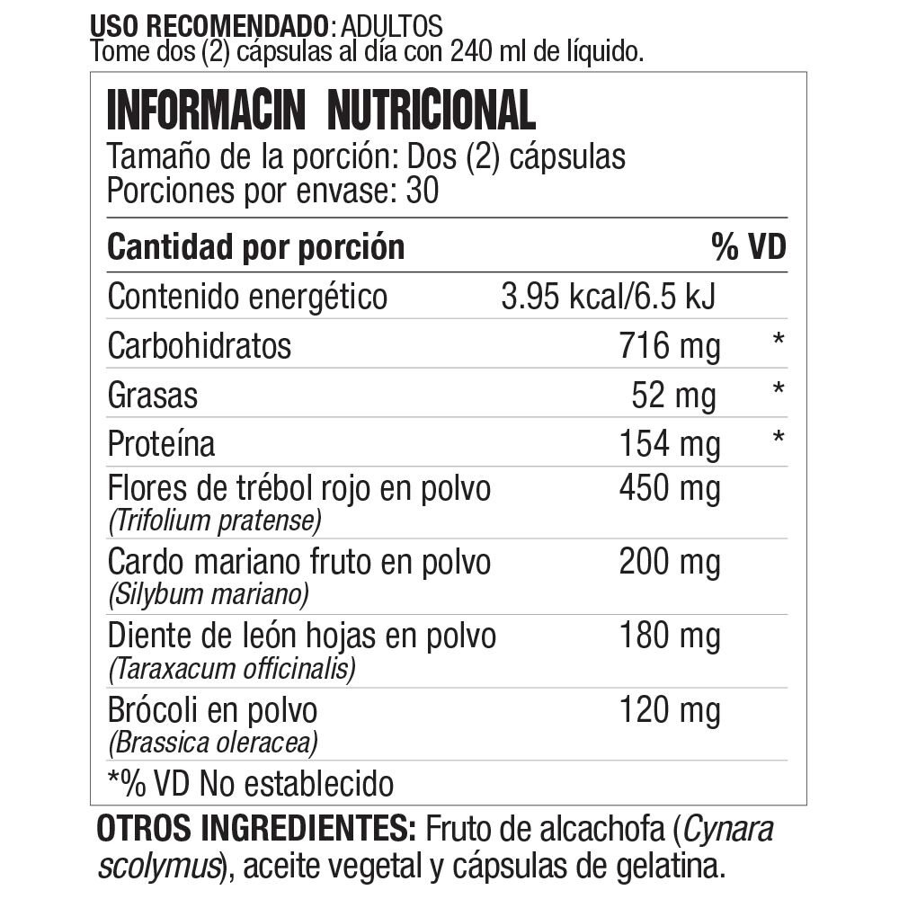 Contiene cardo mariano, trébol rojo, diente de león, brócoli y alcachofa, reconocidos por sus propiedades nutricionales.